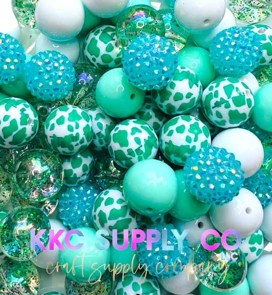 Teal and White Cow Print Bubblegum Bead Mix 20mm